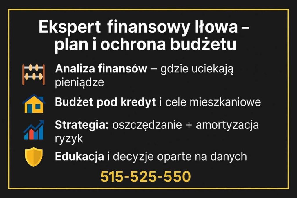 Ekspert finansowy Iłowa – plan i ochrona budżetu: analiza finansów (gdzie uciekają pieniądze), budżet pod kredyt i cele mieszkaniowe, strategia oszczędzania i amortyzacji ryzyk, kontrola kosztów RRSO i opłat, edukacja i decyzje oparte na danych. Kontakt 515-525-550.