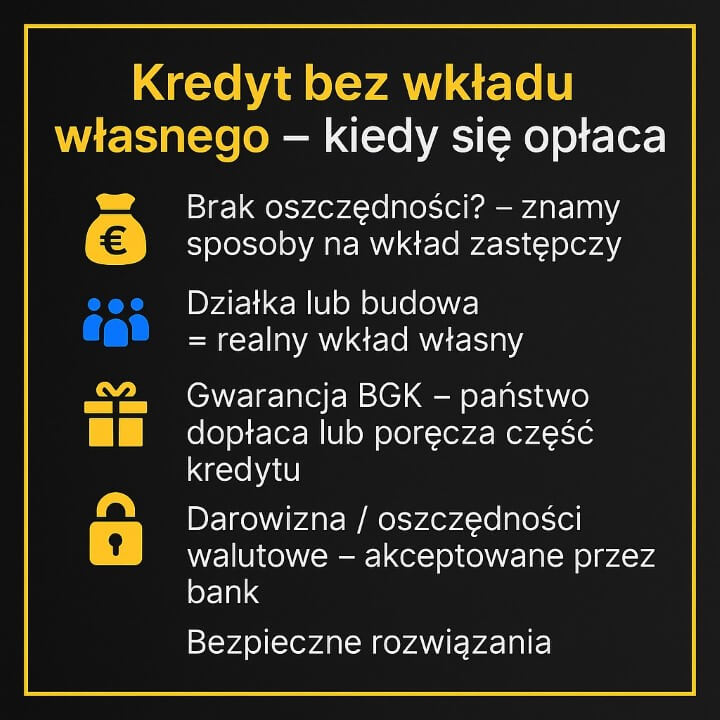 📖 Przykład z Iłowej: Pan Rafał, 32 lata, pracujący w Niemczech, miał stabilne dochody, ale żadnych oszczędności w złotówkach. Bank odrzucił jego wniosek z powodu braku wkładu. Po analizie przygotowaliśmy alternatywę: środki z konta walutowego w EUR i działka rodziców pod Żaganiem jako dodatkowe zabezpieczenie. W ciągu trzech tygodni kredyt został przyznany – bez wkładu własnego, z pełnym finansowaniem budowy domu.