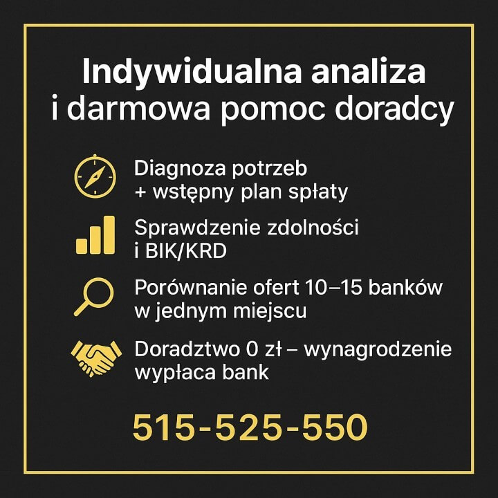 Zakres wsparcia: diagnoza potrzeb i wstępny plan spłaty, sprawdzenie zdolności oraz BIK/KRD, porównanie 10–15 banków w jednym miejscu, doradztwo 0 zł opłacane przez bank. Numer kontaktowy 515-525-550.