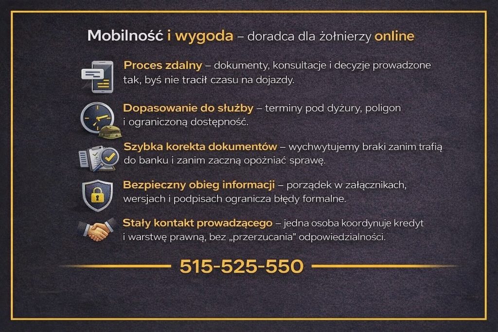 Efekt jest prosty: żołnierze obsługiwani przez specjalistę płacą mniej i dostają decyzje szybciej, bo system bankowy widzi ich faktyczną stabilność.