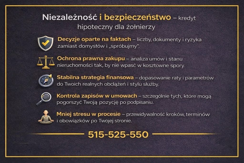 📞 Zadzwoń teraz – +48 515-525-550! Jesteśmy doradcą kredytowym i prawnikiem w jednym – prowadzimy mundurowych od pierwszej rozmowy aż do aktu notarialnego.