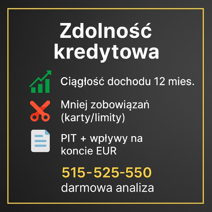 Zdolność kredytowa to ciągłość dochodu 12 miesięcy, mniej zobowiązań (karty/limity), PIT i wpływy na koncie w euro. Darmowa analiza i symulacje w kilku bankach z doradcą i prawnikiem. Telefon: 515-525-550.