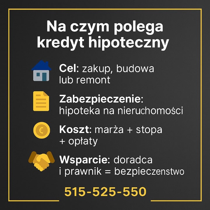 Kredyt hipoteczny Małomice: cel zakupu, budowy lub remontu; zabezpieczenie hipoteką; koszt = marża + stopa + opłaty; wsparcie doradcy i prawnika. Czarno-złota infografika, czytelne ikony i CTA telefonu.