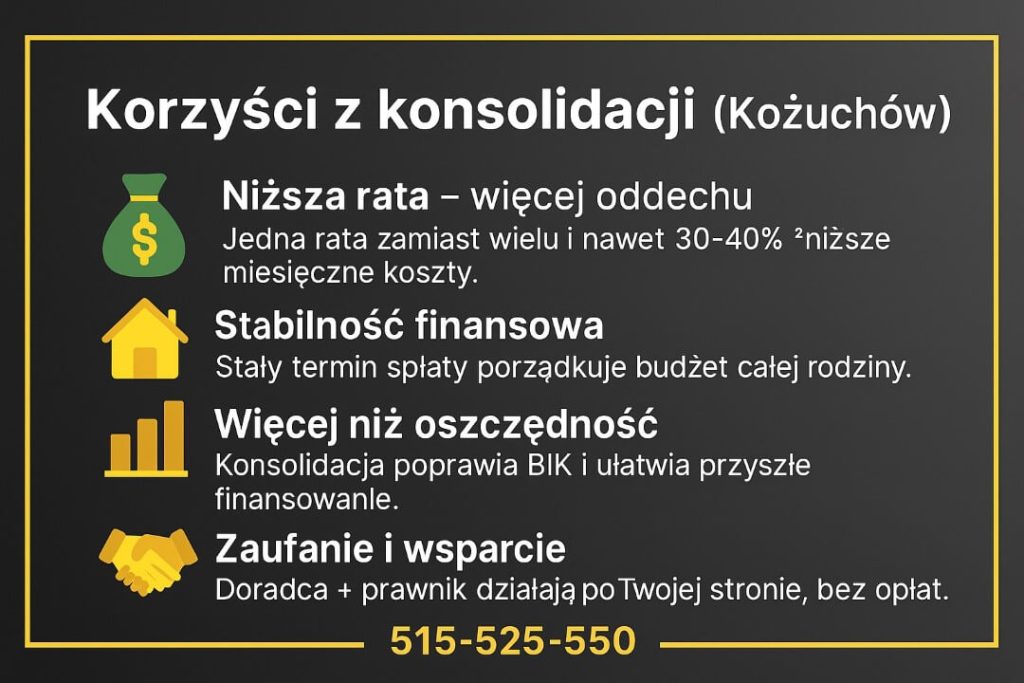 💡 Warto wiedzieć – kredyt konsolidacyjny to nie nowy dług, lecz narzędzie porządkujące finanse. W Kożuchowie wielu klientów po konsolidacji odzyskało pełną kontrolę nad budżetem i uniknęło windykacji. Właśnie dlatego warto przejść ten proces z doradcą i prawnikiem w jednym – bez opłat i bez ryzyka.