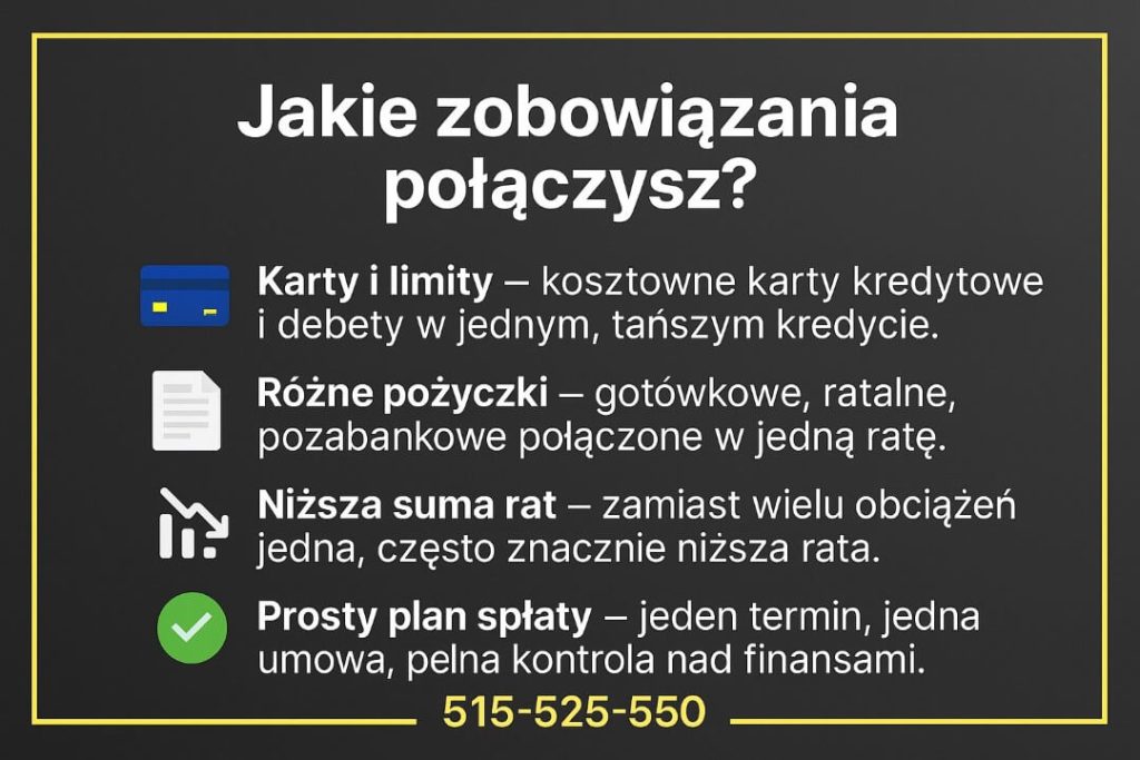 - ✔️ Konsolidacja może obejmować niemal wszystkie rodzaje zobowiązań: kredyty, karty, limity, pożyczki pozabankowe.