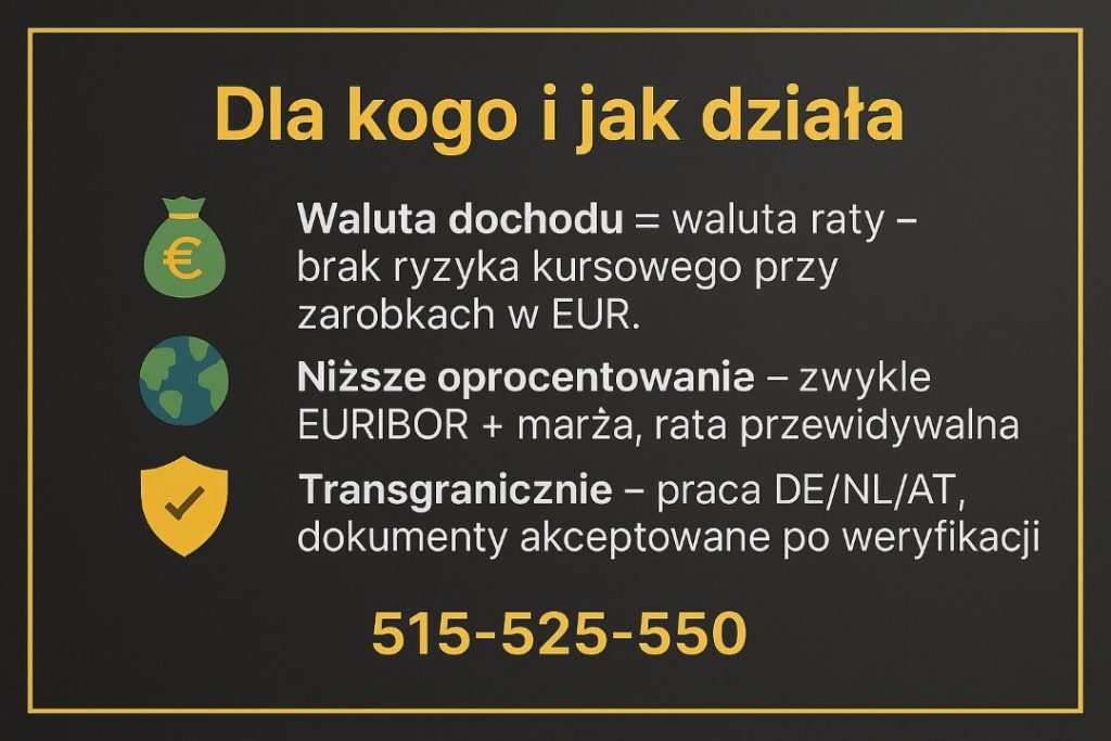 | Zobowiązania w EUR | ✅ Tak | Opcja dla osób zarabiających w euro lub w strefie przygranicznej |