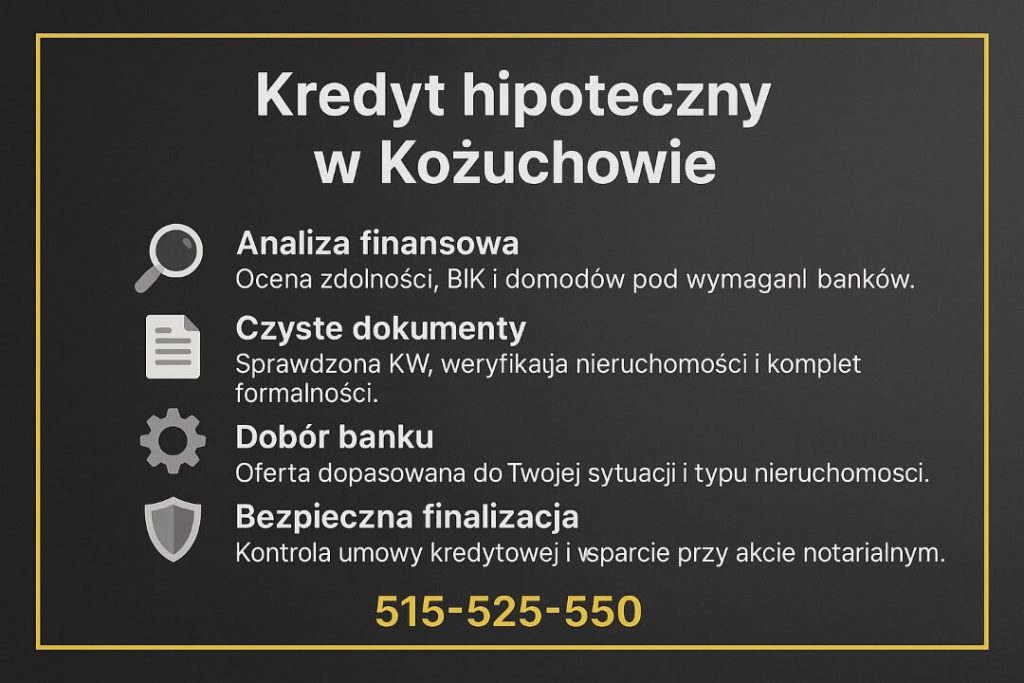 - Kredyt hipoteczny Kożuchów to proces wieloetapowy: od analizy KW, przez dobór banku, po bezpieczną finalizację u notariusza.